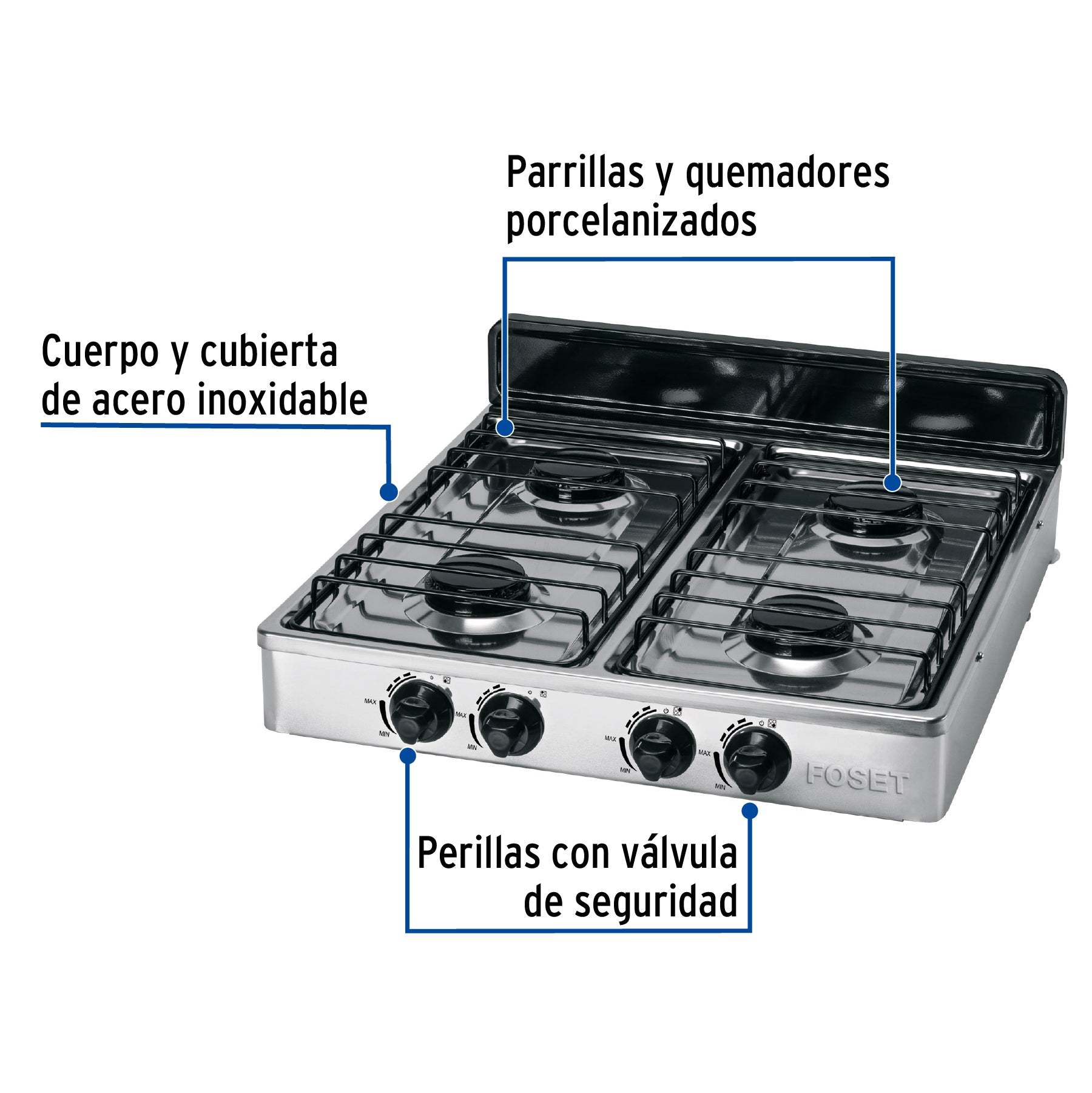 Parrilla de gas de sobreponer 4 quemadores, inox, FOSET